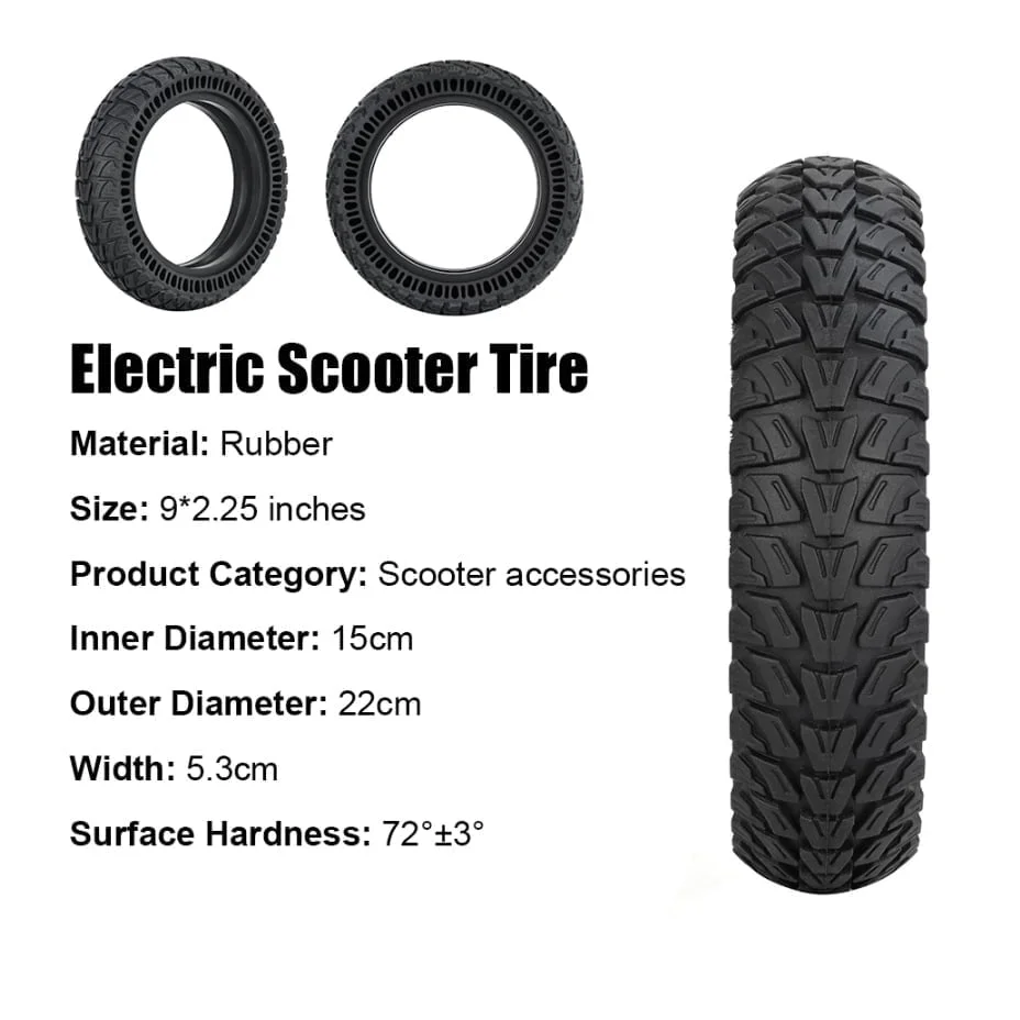 Solidt 9×2.25-6.1 punkteringsfritt terräng däck . Profil utformad för att anpassa sig till alla typer av terräng. Dess noppiga slitbana ger utmärkt rullmotstånd.